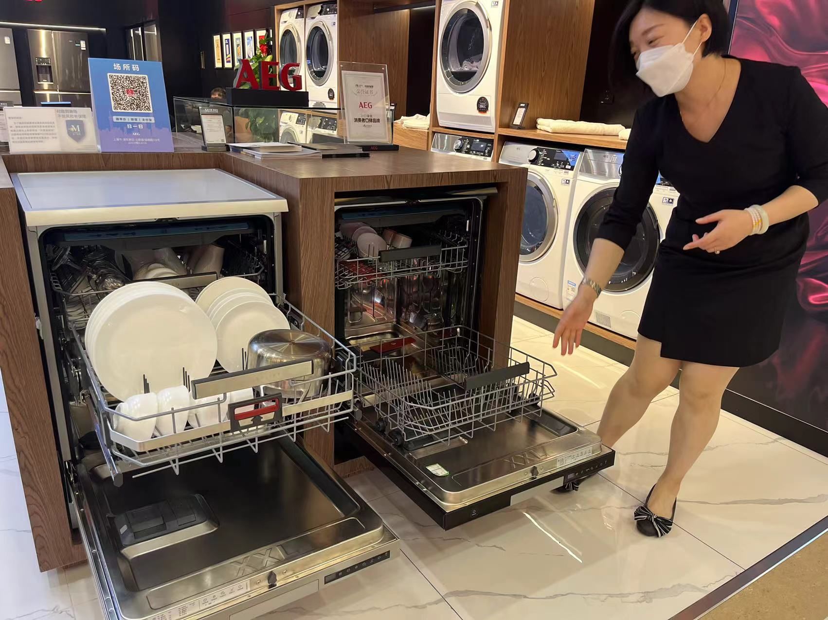 记者在现场看到,红星美凯龙浦东沪南商场智能电器馆位于商场五楼,产品涵盖厨房家电、大家电、进口电器、生活家电、系统家电、智能家居灯具六大品类,总面积达1.2万平方米,吸引了国内外众多一线大牌入驻,其中既包括海尔、卡萨帝、海信等国内家电头部品牌,也包括美诺、AEG、松下、三星、LG等国际高端电器品牌。